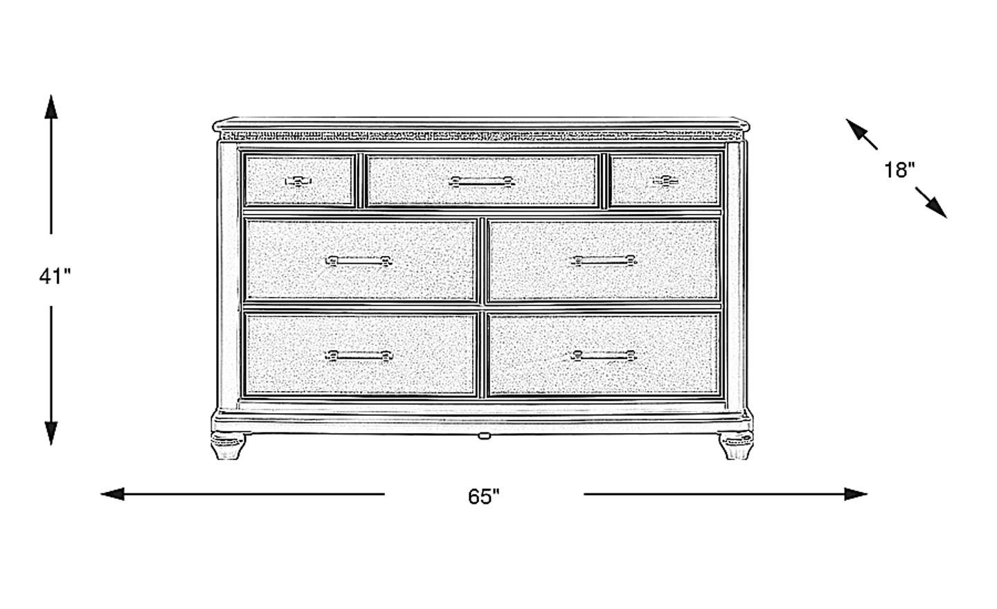 Capture the magic of Old Hollywood with the glamorous Starlet Lane dresser. Crafted in a stunning silver finish with shimmering embellishments in the upper molding frame, its star quality shines through immediately. The drawers feature ball bearing glides with French dovetails in the front and English dovetails in the back, all while clear accent handles and texturing on the front surface panes provide even more visual intrigue. Bottom drawers are dust proof to keep your belongings fresh and free of debris.