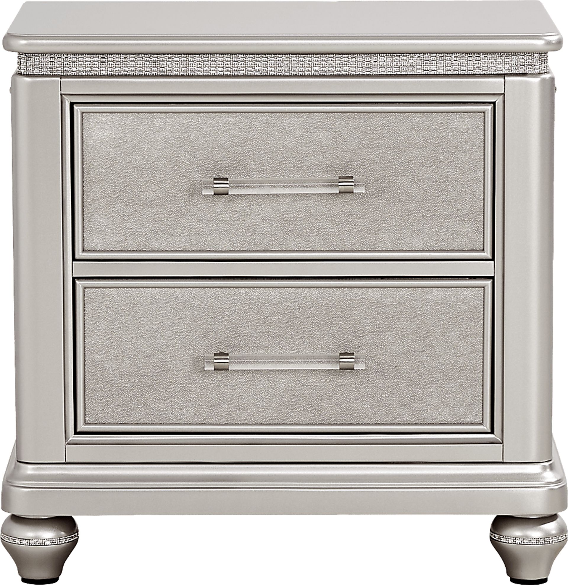 Capture the magic of Old Hollywood with the glamorous Starlet Lane nightstand. Crafted in a stunning silver finish with shimmering embellishments in support of the nightstand's top, it's easy to recognize the star quality immediately. The drawers feature ball bearing glides with French dovetails in the front and English dovetails in the back, all while clear accent handles and texturing on the front surface panes provide even more visual intrigue. Bottom drawers are dust proof to keep your belongings fresh and free of debris. Additionally, you'll find two USB ports for easy charging of your devices.