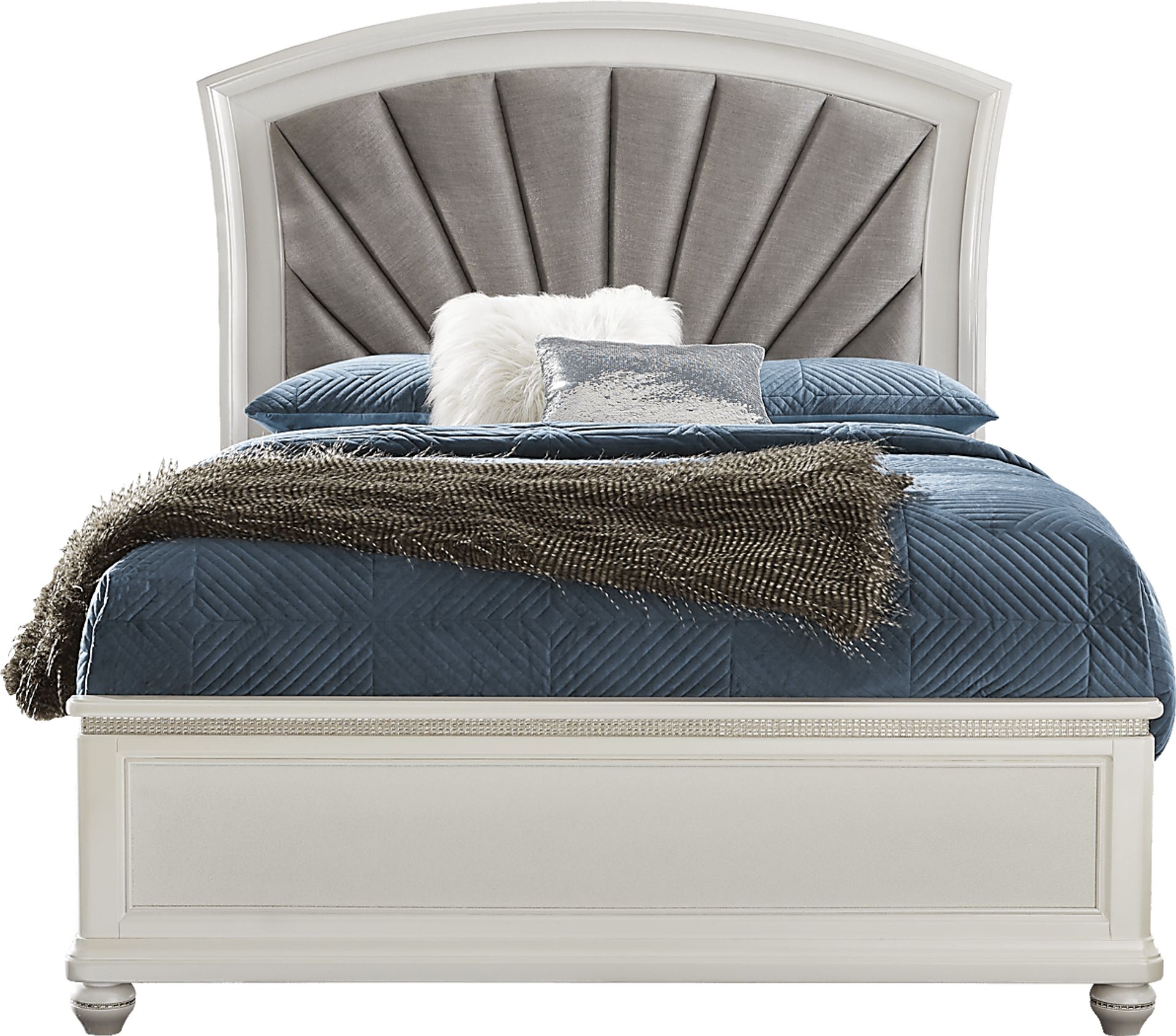 Capture the magic of Old Hollywood with the glamorous Starlet Lane bed. Crafted from pine solids in a gilded pearl finish, this queen-sized bed features a headboard with a top arch that runs over gentle curving side edges. Offsetting the headboard's sparkling white is a gray upholstery framed by an LED strip for plenty of light. Shimmering accenting and bun feet on the bed's panel footboard help set the scene for a good night's sleep. Mattress and foundation (if required) sold separately.