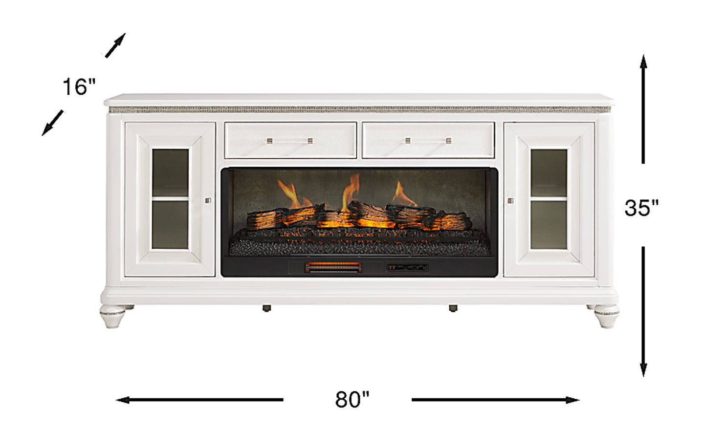 Capture the magic of Old Hollywood with the glamorous Starlet Lane collection's lustrous details and opulent hues. Contemporary in style, this console comes in a gilded pearl finish with shimmering embellishments that exude star-worthy glamour. Two center drawers with sparkling textured fronts provide hidden storage, while two outer doors with glass inlays offer the perfect space to showcase decorative accents. The electric fireplace features innovative flame effects on bricks and logs for added depth and 3D realism, conveniently controlled by remote to adjust the flame and glow levels. Clear acrylic pulls with silver metal accents and bun feet with bedazzled bands complete the look with a touch of sparkly sophistication.