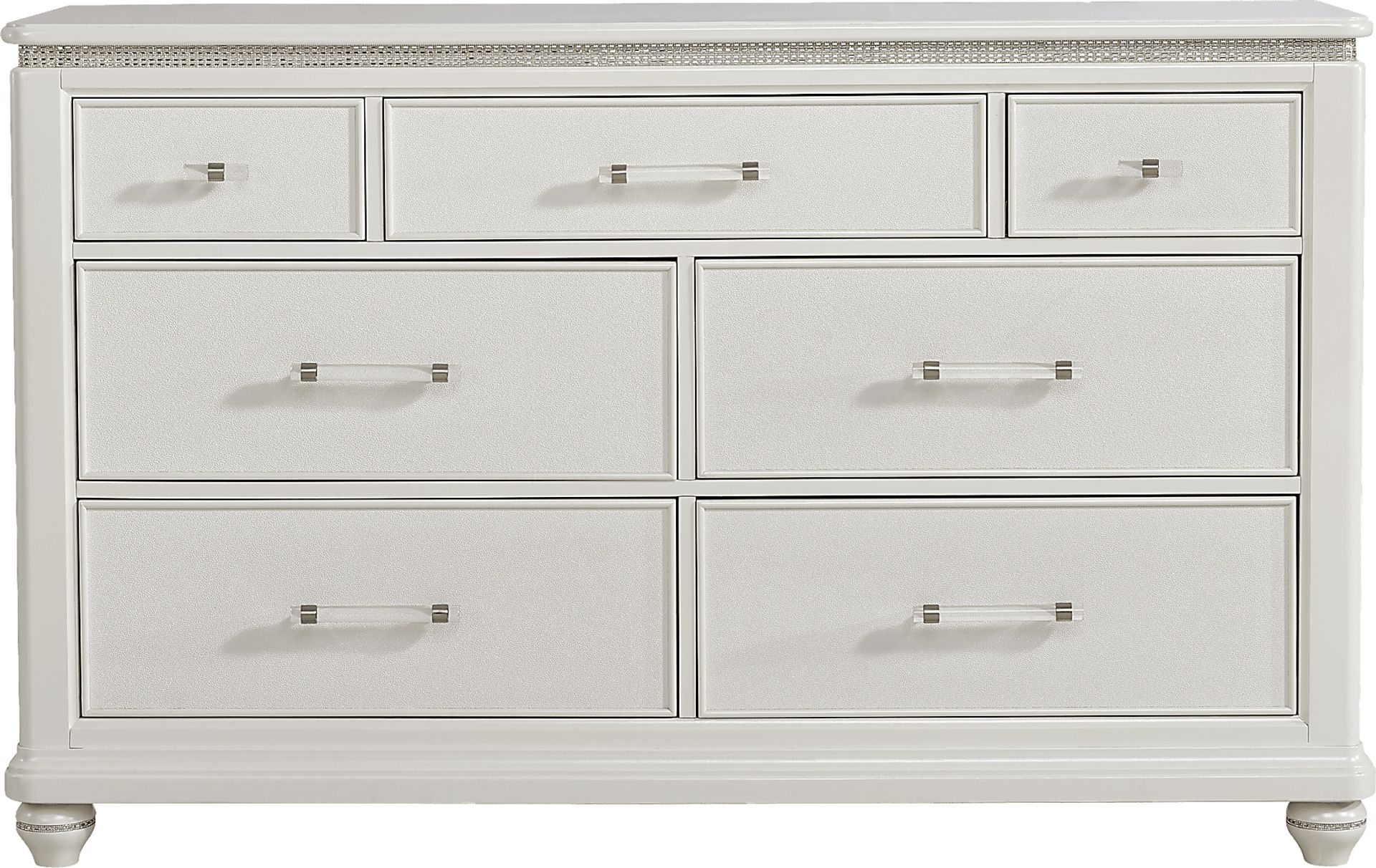 Capture the magic of Old Hollywood with the glamorous Starlet Lane dresser. Crafted in a gilded pearl finish with shimmering embellishments in the upper molding frame, its star quality shines through immediately. The drawers feature ball bearing glides with French dovetails in the front and English dovetails in the back, all while clear accent handles and texturing on the front surface panes provide even more visual intrigue. Bottom drawers are dust proof to keep your belongings fresh and free of debris.