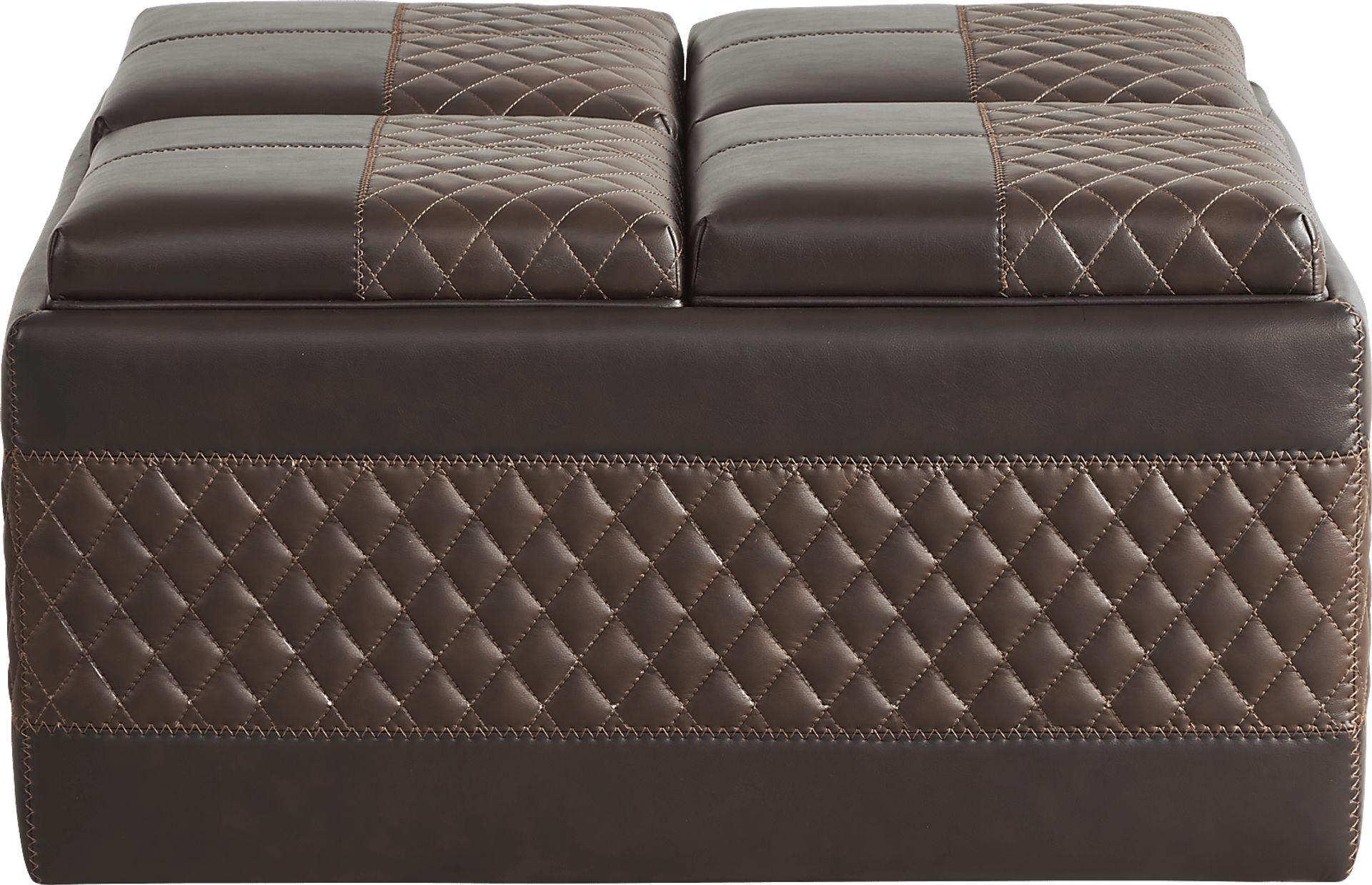 With living room style that serves up convenience for any get together, the Starline Road ottoman stands out in a crowd. On the outside, this spacious ottoman features exquisite quilted details in rich brown upholstery with a leather look that is as durable as it is easy to clean. However, when it's time to entertain guests or family, watch this ottoman turn into the center of attention with 4 hidden trays in the top and four included seats, two round and two square! If you ever need to clear some space for your next get together, this ottoman also features hidden casters for easy repositioning.