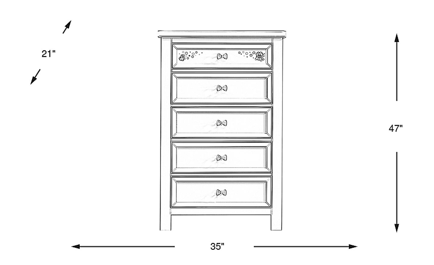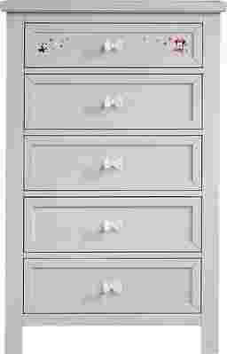 Features an artful depiction of Minnie and Figaro, the Starry Dreams chest is a sweet choice for your child's bedroom. The five drawers feature custom pink bow pulls and have plenty of room for keeping some of your child's clothing organized. Crafted of hardwood solids, this piece comes in a painted gray finish that blends well with a wide range of styles. The art panel is removable.