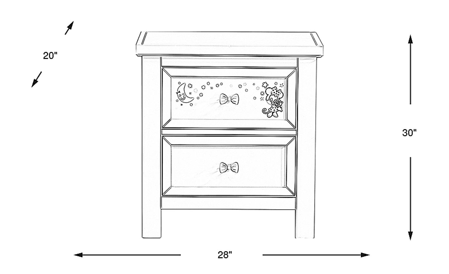 Put the "fun" in functional bedside storage with the Starry Dreams nightstand. Both drawers have custom pink bow pulls with room for reading materials and more. The tabletop can be used for displaying photos, collectibles and more. Crafted of hardwood solids in a beautiful painted gray finish, the frame features a removable art panel that has a serene depiction of Minnie Mouse gazing peacefully at the stars.