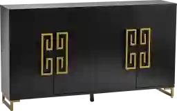 Crafted from acacia wood and iron, the Startimea black sideboard showcases a sleek black painted finish with gold accents for a bold, modern look. Four oversized brushed gold handles with a geometric design enhance its striking aesthetic, complemented by powder-coated gold legs. Behind four doors with European hinges and magnetic closures, two fixed shelves provide ample storage. Two cord management holes ensure easy organization, while floor levelers offer stability. Customer assembly is required.