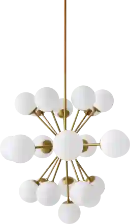 Illuminate your space with the chic sophistication of the Starwalk Gold Chandelier. Perfectly embodying Mid-Century Modern style, this stunning fixture brings a touch of vintage elegance to any room. Crafted from durable iron and featuring sleek glass shades, it's designed to make a statement while providing warm, inviting light. Whether you're hosting dinner parties or enjoying quiet evenings at home, this chandelier is sure to enhance your decor with its timeless charm and radiant glow. Professional installation by an electrician is recommended.