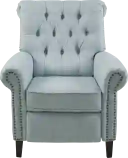 The Starware blue manual recliner blends classic details with modern versatility. Featuring a rolled back, button tufting, and nail head trim, it brings timeless charm to any room. The manual push-back mechanism offers three reclining positions for customized comfort. Upholstered in a soft, durable fabric and built with a sturdy wood frame, pocket coils, and solid wood legs, it delivers both style and support. Its compact footprint and cordless design make it easy to place anywhere. Customer assembly is required.