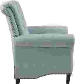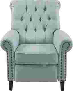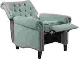 The Starware blue manual recliner blends classic details with modern versatility. Featuring a rolled back, button tufting, and nail head trim, it brings timeless charm to any room. The manual push-back mechanism offers three reclining positions for customized comfort. Upholstered in a soft, durable fabric and built with a sturdy wood frame, pocket coils, and solid wood legs, it delivers both style and support. Its compact footprint and cordless design make it easy to place anywhere. Customer assembly is required.