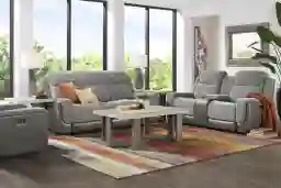 Includes:gray dual power reclining sofa • beige stationary loveseat • brown cherry 3 pc table set • black table lamp (2)