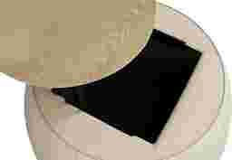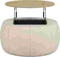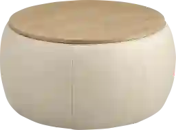 Brimming with romance, charm and handsome sophistication, you'll fall madly for the Stefano collection's irresistible comfort and incredible style. Upholstered with top grain leather where the body touches, the round ottoman is equipped with a lift top and concealed storage. The taupe color of the fabric compliments the modern aesthetic to perfection. Upholstery: Top grain leather where the body touches and polyurethane fabric sides and backs.