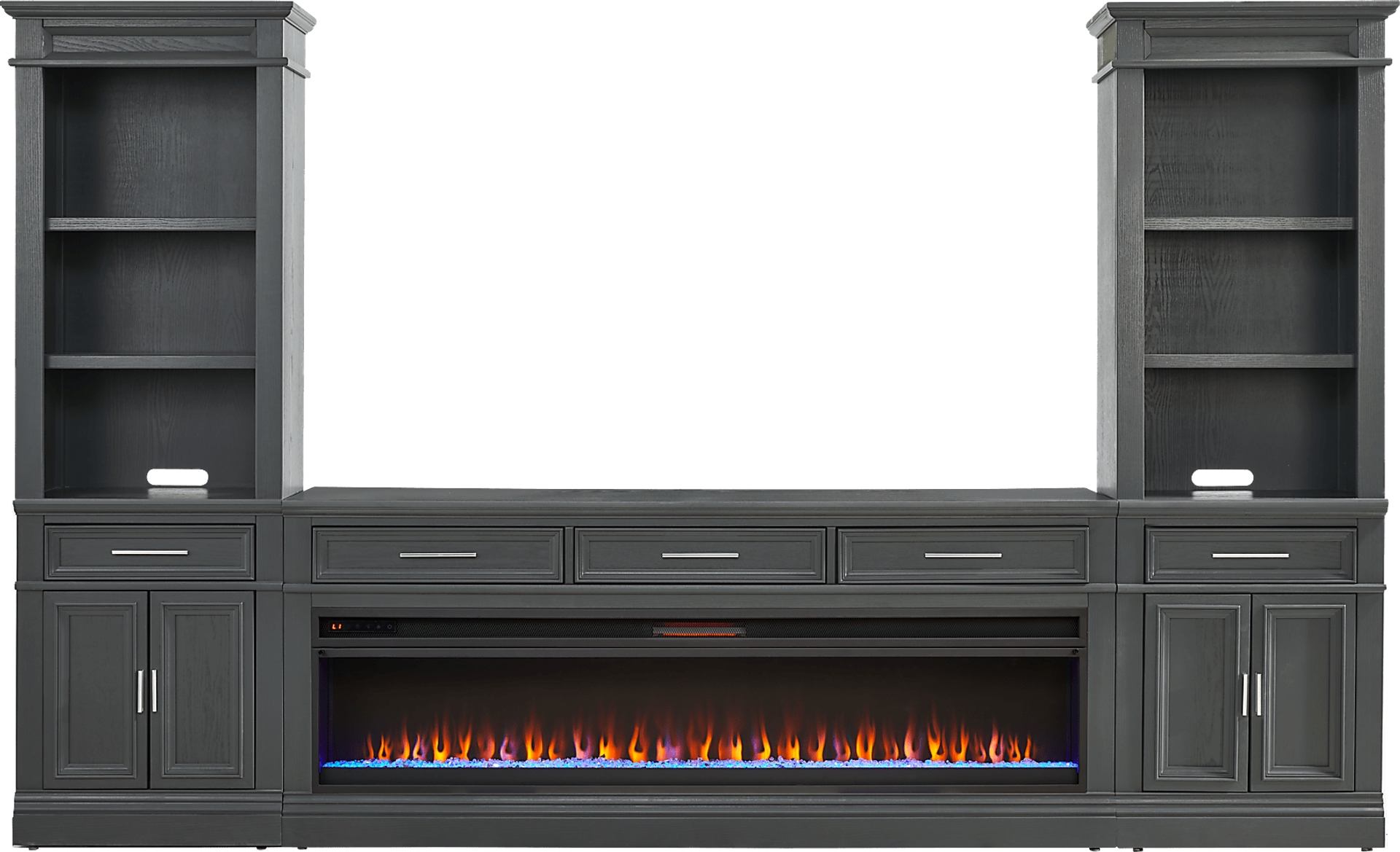 Transforming your space into a versatile hub of cinematic elegance, the Stephenson wall unit combines timeless allure with modern charm for irresistible appeal. This transitionally styled unit comes in a beautiful dark gray hue and offers plenty of storage space. At the center lies a 78" console, featuring three top felt-lined drawers that are great for storing away your delicate electronics. Below the drawers is an energy-saving LED firebox with remote controlled heat and ambient lighting with four color changing options, keeping your room warm and cozy. A storage pier at each end provides an additional drawer, a two-door cabinet and three shelves ideal for books, family photos and more. Sleek metal pulls in a silver finish adds a stylish final touch.