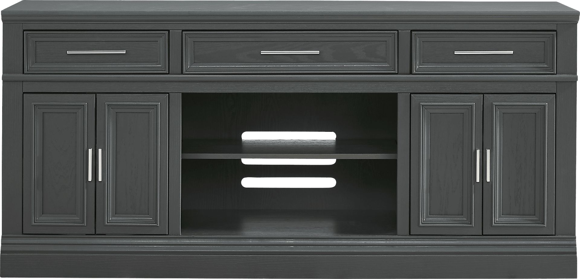 Transforming your space into a versatile hub of cinematic elegance, the Stephenson console combines timeless allure with modern charm for irresistible appeal. This transitionally styled piece comes in a beautiful dark gray hue and offers plenty of storage space. Three top felt-lined drawers provide storage for your delicate electronics while two-door cabinets on both ends offer organized storage with their spacious shelf and wire management holes. Below the center drawer is an open shelf with more wire management holes offering a clutter-free display space. Sleek metal pulls in a silver finish adds a stylish final touch.