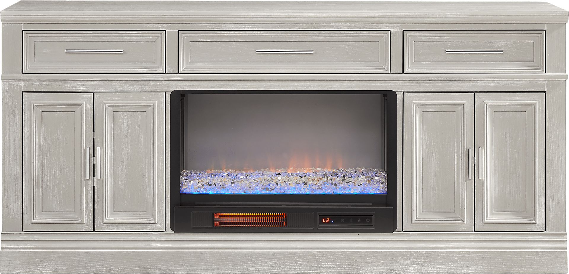 Transforming your space into a versatile hub of cinematic elegance, the Stephenson console combines timeless allure with modern charm for irresistible appeal. This transitionally styled unit comes in a beautiful light gray hue and features three top felt-lined drawers and two-door cabinets on both ends for organized storage. Below the center drawer is an energy-saving LED firebox with remote controlled heat and ambient lighting with four color changing options, keeping your room warm and cozy. Sleek metal pulls in a silver finish adds a stylish final touch.