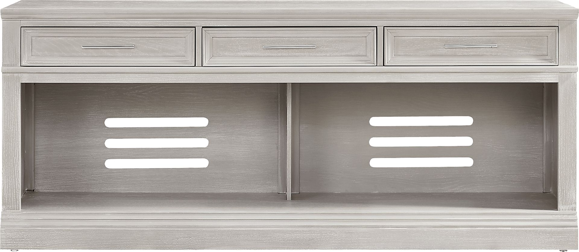 Transforming your space into a versatile hub of cinematic elegance, the Stephenson console combines timeless allure with modern charm for irresistible appeal. This transitionally styled piece comes in a beautiful light gray hue and features three top felt-lined drawers that are great for storing away your delicate electronics. Below the drawers is an open space with wire management holes offering a clutter-free display space. Sleek metal pulls in a silver finish adds a stylish final touch.