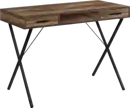 This widely versatile industrial style Stillirock desk finished in a brown reclaimed wood-look laminate is equally functional as a computer desk, writing table or study center. Sized for small homes, apartments or condos, space saving is a breeze thanks to this piece that is supported by a sturdy black metal X-shaped trestle legs to ensure stability and a comfortable work environment. This office desk is equipped with two convenient and easy-open storage drawers for all you need to store away while not in use. With lots of space to push the chair in, the desk is compact, while the desktop has the perfect amount of surface space for a laptop/tablet, lamp, notebook and some important supplies to get the job done. Customer assembly is required.