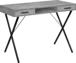 This widely versatile industrial style Stillirock desk finished in a gray wood-look laminate is equally functional as a computer desk, writing table or study center. Sized for small homes, apartments or condos, space saving is a breeze thanks to this piece that is supported by a sturdy black metal X-shaped trestle legs to ensure stability and a comfortable work environment. This office desk is equipped with two convenient and easy-open storage drawers for all you need to store away while not in use. With lots of space to push the chair in, the desk is compact, while the desktop has the perfect amount of surface space for a laptop/tablet, lamp, notebook and some important supplies to get the job done. Customer assembly is required.