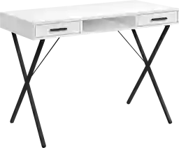 This widely versatile industrial style Stillirock desk finished in a white laminate is equally functional as a computer desk, writing table or study center. Sized for small homes, apartments or condos, space saving is a breeze thanks to this piece that is supported by a sturdy black metal X-shaped trestle legs to ensure stability and a comfortable work environment. This office desk is equipped with two convenient and easy-open storage drawers for all you need to store away while not in use. With lots of space to push the chair in, the desk is compact, while the desktop has the perfect amount of surface space for a laptop/tablet, lamp, notebook and some important supplies to get the job done. Customer assembly is required.