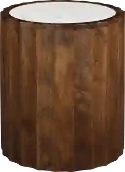 Bring a touch of elegance to your living space with this stunning Stinsonville side table. The base boasts solid Mango wood construction in a warm brown finish, featuring linear curved beveling that is sure to catch the eye. The round white marble top, with natural gray veining, is encased within the beautiful frame, ensuring that each piece is unique. For a complete and stylish look, pair it with the matching cocktail table. Customer assembly is required.