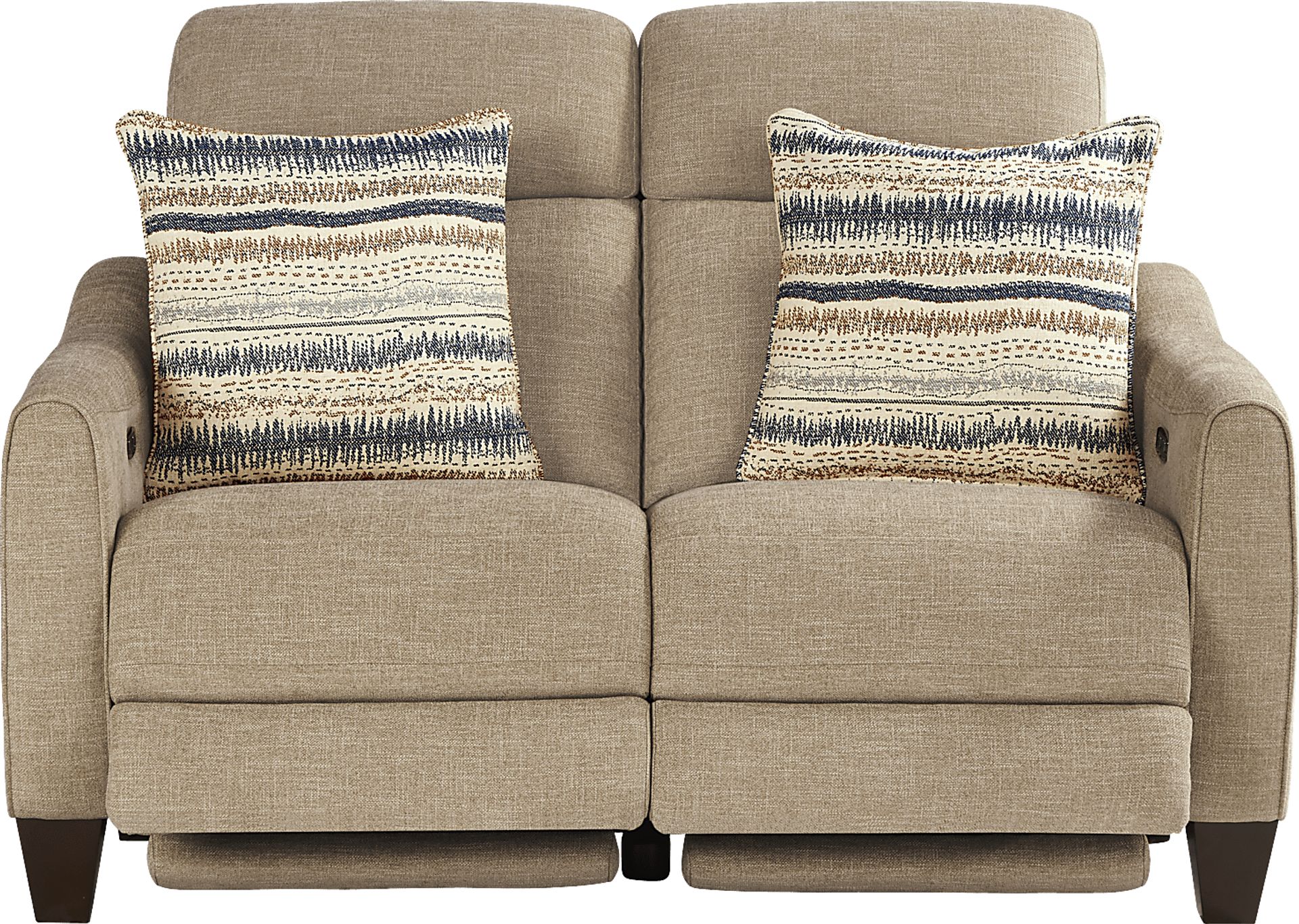 Balancing a timeless appearance with super sleek amenities, the Stonecrest loveseat delivers ultimate family room relaxation. Head to toe, dual power, zero gravity reclining features allow you to raise and lower your headrest and footrest to any desired position for absolute maximum comfort. You can even conveniently charge your tablet, phone and more with the USB ports located on the control panels. Woven chenille upholstery in a sleek camel color is complimented by subtle top-stitch seam details, sloped dome arms and coordinating feather blend accent pillows. Block legs in brown finish give this high-tech piece the classic look of a traditional loveseat. 100% Polyester