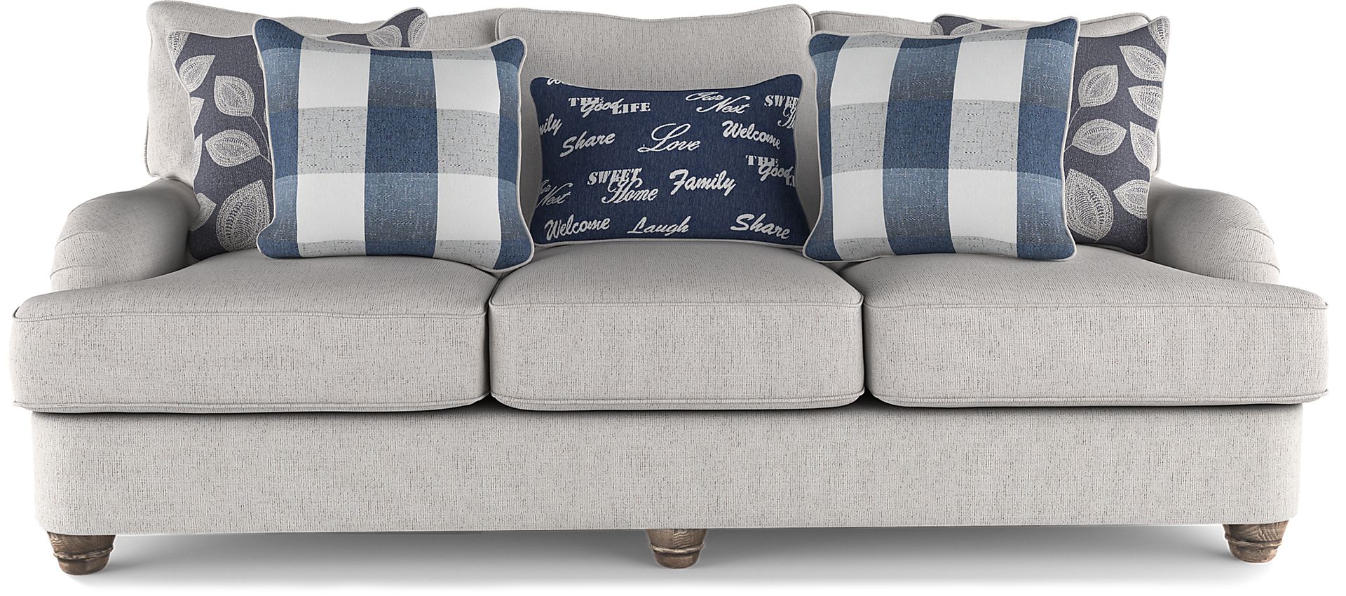The Stonehill sofa embodies farmhouse style thanks to its primly pleated Charles of London arms and gray-finished turned legs. The seat cushions are reversible to extend the life of the sofa and can be conveniently secured to the rest of the piece with attached ring fasteners. Soft beige upholstery with chic welting and a variety of patterned accent pillows surround you in comfort for an appealing finishing touch. Upholstery: 91% Polyester, 9% Olefin.