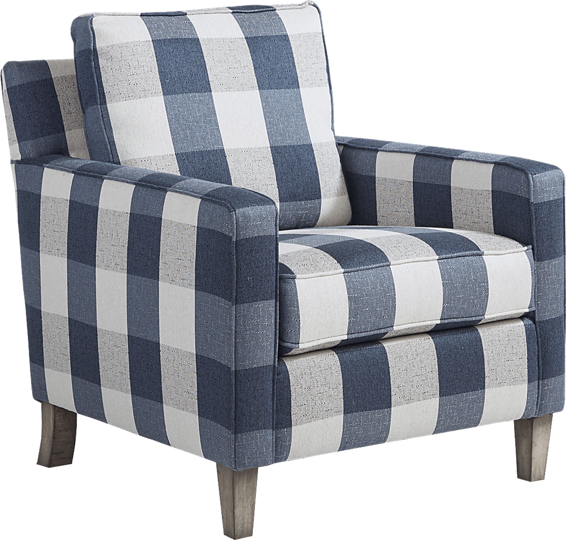 With charming blue plaid upholstery and sleek track arms, the Stonehill accent chair adds instant farmhouse style to your space. Elevated by gray-finished tapered legs and offering a conveniently reversible seat cushion for longevity, this appealing piece is perfect for completing your living room look. Upholstery: 91% Polyester, 9% Olefin.