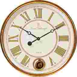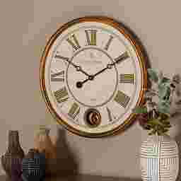 Add a touch of elegance to your wall with the Stonham wall clock. Encased within a stunning gold-finished frame, the Stonham showcases a distressed white Roman numeral clock face with a French-inspired inscription. The classic design of this clock is further highlighted by the brass pendulum which swings beneath the hands. Mount this piece over the mantel or any space in need of some refined charm. This clock requires one AA battery to operate, which is not included.