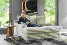 The horizontal channeling is more than a contemporary style choice; it provides structured comfort by keeping the interior padding evenly distributed, which prevents the backrest from sagging after prolonged use. Complementing this are the double-padded wedge arms, which offer a wide, stable surface for resting your arms or leaning against while reading. These architectural details ensure that the chaise maintains its "plush" aesthetic and supportive feel even with daily lounging.