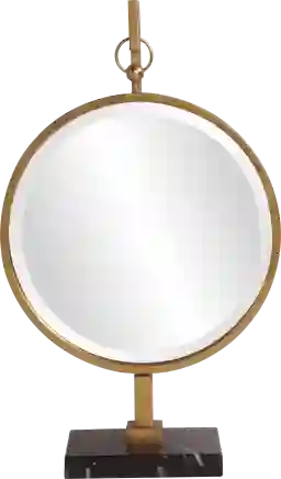 The Struan mirror is a sophisticated piece that sits on your table instead of your wall. This piece features a round, gold framed mirror that hangs from a matching fixture with a black faux marble base. Alone or in multiples, this mirror is a perfect accent piece for console tables, book shelves or any room in your home.