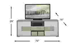 With a clean, contemporary look, the Studio Place console delivers excellent style and storage. This 74-inch console has a two-tone gray and white gloss finish that is both chic and adaptable to your space. Crafted with matte wood laminate and Italian lacquer, its construction evokes a natural tone that uniquely contrasts with its sleek, symmetrical design. Open cubbies give you the freedom to display your own decor, while additional space and a storage shelf is hidden behind each of the two doors.