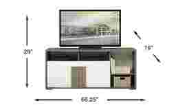 Characterized by minimalist, contemporary style, the Studio Place console epitomizes sleekness. This 66-inch console has a two-tone taupe and white gloss finish that is both chic and adaptable to your space. Crafted with matte wood laminate and Italian lacquer, its construction evokes a natural tone that uniquely contrasts with the clean lines of its asymmetrical design. An open concept design gives you the freedom to display your own decor, while two doors reveal additional storage space.