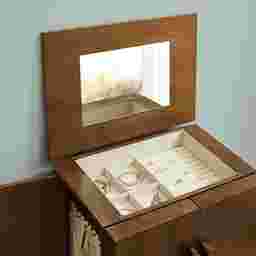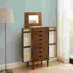 Beyond the side-door hooks, this armoire features seven spacious drawers for organized storage of watches, bracelets, and larger keepsakes. It also includes a hidden top compartment that opens to reveal a built-in mirror, providing a convenient station for quick touch-ups and easy access to your most-worn rings and daily essentials.