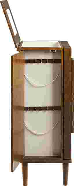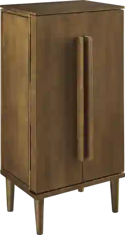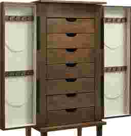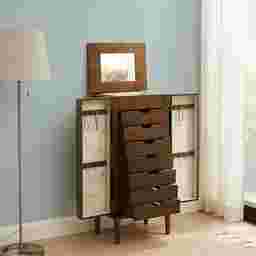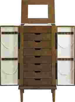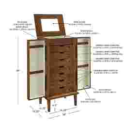 Keep your collection beautifully organized with the Suari stunning jewelry armoire, a modern essential for the well-appointed dressing area. The warm walnut finish lends to a refined yet earthy aesthetic, while soft cream felt lining within protects every piece with care. A hidden top compartment with a mirror provides a convenient spot for quick touch-ups and easy access to rings and bracelets. Front double doors open to reveal 16 necklace hooks that prevent tangles, as well as 7 spacious drawers for earrings, watches, and keepsakes. Stylish, functional, and timelessly elegant, this armoire is a game-changer for jewelry lovers and collectors. Customer assembly required.
