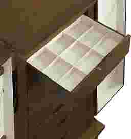 The interior is fully lined with a soft cream-colored felt. This plush material provides a gentle, non-abrasive surface that helps prevent scratches on polished metals and delicate gemstones. For those living in more humid coastal or southern climates, keeping jewelry in a felt-lined, enclosed cabinet like this can also help minimize exposure to moisture in the air.