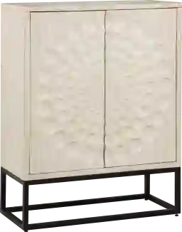 Elevate the ambiance of your space with this exquisite Sugden two-door bar cabinet, ideal for any room. Its soft cream finish complements any color scheme, while the striking circular patterned design on the doors adds texture and movement. With a spacious interior, it includes a hanging stemware rack and adjustable wine bottle shelf, ensuring a delightful hostess experience. Customer assembly is required.