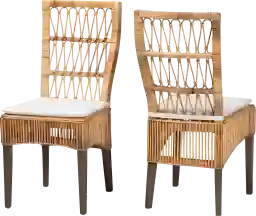 Craft a beloved dining space with the visually striking yet soothing design of the Sullnera brown side chair set of 2. This chair is comprised of a sturdy mahogany wood frame wrapped in natural rattan. Each seat features a plush, fabric upholstered cushion for superb comfort while slim rattan rods combine to form a smooth backrest. The Sullnera will arrive fully assembled and features an open design fitted with bamboo-like embellishments that allow light to flow naturally throughout the room. Showcasing exotic craftsmanship within a modern silhouette, the Sullnera elevates any dining occasion. Due to the nature of the natural materials used in this product, it may have variations in areas such as, but not limited to, color, pattern, grain and texture. The hair-like strands of rattan/rattan-fiber are common due to nature of the material.