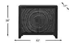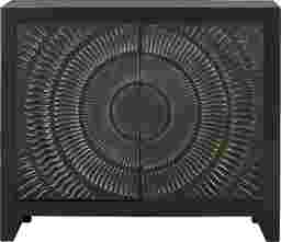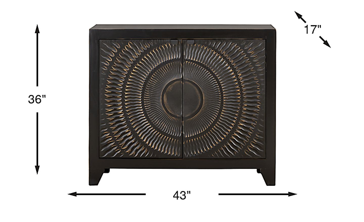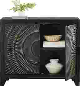 Artful carvings capture the glow of golden hour in the Summerhill collection as it delivers both radiant, gallery-worthy style and practical function. This contemporary, black finished cabinet features two doors carved with striking sunburst medallions that's highlighted by warm metallic accents that add depth and dimension. Clean lines and a low, grounded base keep the silhouette modern, while spacious concealed storage behind the doors offers room for dinnerware, media components or everyday essentials.