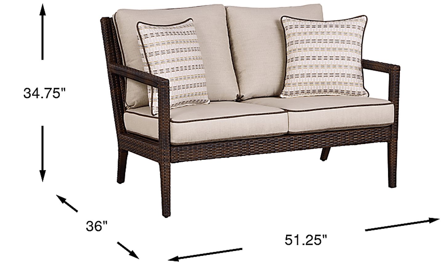 Inspired by relaxed European sophistication, the Summerset Way loveseat combines classic wicker weave with a sleek slanted back. Crafted over an aluminum frame, the rich brown finish contrasts nicely with the sandstone beige solution-dyed performance fabric cushions and coordinating welting. Accent pillows add a casual touch. High performance acrylic fabric.