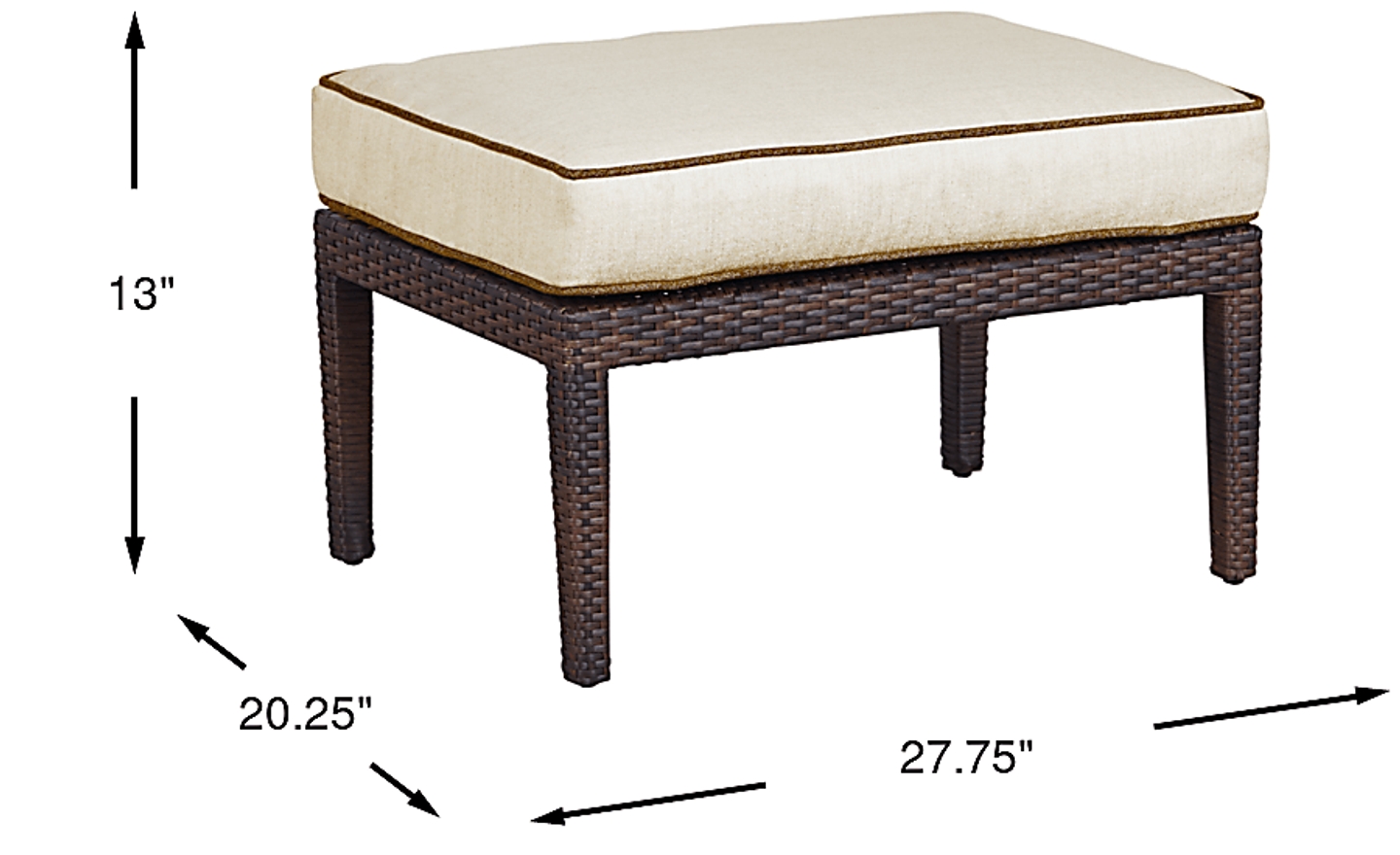 The Summerset Way ottoman provides a comfortable place to rest tired feet in your outdoor space. Crafted with a lightweight aluminum frame beneath classic wicker weave, the brown finish provides a rich contrast with the sandstone beige cushion. Coordinating welting on the solution-dyed performance fabric adds to the casual, pulled together look. High performance acrylic fabric.