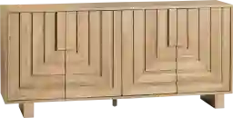Crafted from solid oak wood, the Sunbeat brown sideboard showcases a natural brown wood grain finish that enhances its organic appeal. The rectangular design features four intricately paneled wooden doors with European hinges and magnetic closures, concealing two spacious cabinets with interior shelves for organized storage. Two cord management holes at the back keep wires neatly tucked away, while the sturdy base ensures durability. Customer assembly is required.