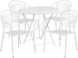 Brighten up your patio space with the beautiful Sunnyside Terrace white 5 Pc 30" round folding patio table set. This colorful set will enhance your bistro, cafe, restaurant, hotel, or home patio space. With the convenience of a folding table you can use it as a temporary placement or fold away for storage or cleaning the space. Quickly unfold the table by pulling the center brace. The four round back patio chairs stack for storing. The frames are designed for all-weather use, making it a great option for indoor and outdoor settings. For longevity, care should be taken to protect from long periods of wet weather. The possibilities are endless with the multitude of environments in which you can use this table for both commercial and residential spaces. Includes one 30 inch round table and four round back chairs. Assembly required.