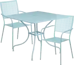 Brighten up your patio space with the beautiful Sunrise Garden blue 3 pc 35.5 inch square patio set. This colorful set will enhance your bistro, cafe, restaurant, hotel, or home patio space. The top includes an umbrella hole (umbrella not included). The two square back patio chairs stack for storing. The frames are designed for all-weather use, making it a great option for indoor and outdoor settings. For longevity, care should be taken to protect from long periods of wet weather. The possibilities are endless with the multitude of environments in which you can use this table for both commercial and residential spaces. Includes one 35.5 inch round table and 2 square back chairs. Assembly required.