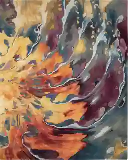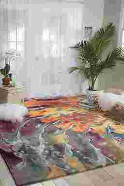 The Sunset Fire rug commands attention with bold and vibrant colors swirled into a captivating inferno of softness, beauty and balance. Hand-tufted fiery shades of orange, crimson and purple are offset by smoky charcoal and white in this highly durable silken wool rug.