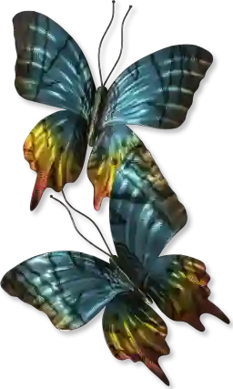 The Sunset Moth Pair wall art piece can light up any space with its striking array of colors. Handcrafted of stainless steel, this artwork features shades of blue, yellow and orange for an eye-catching look you and your guests will love. Perfect for covered patio spaces, this durable piece is made to last. No direct exposure to water or sunlight. For best results apply a premium wax, such as car or boat wax to the product. Apply prior to hanging outdoors and reapply every 6-12 months. Do not use waxes that contain cleaners (such as boat "cleaner/wax") as these will damage the surface.
