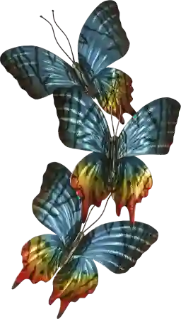 The Sunset Moth Trio wall art piece can light up any space with its striking array of colors. Handcrafted of stainless steel, this artwork features shades of blue, yellow and orange for an eye-catching look you and your guests will love. Perfect for covered patio spaces, this durable piece is made to last. No direct exposure to water or sunlight. For best results apply a premium wax, such as car or boat wax to the product. Apply prior to hanging outdoors and reapply every 6-12 months. Do not use waxes that contain cleaners (such as boat "cleaner/wax") as these will damage the surface.