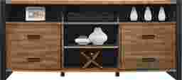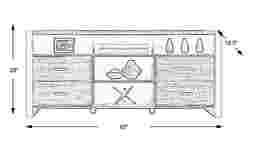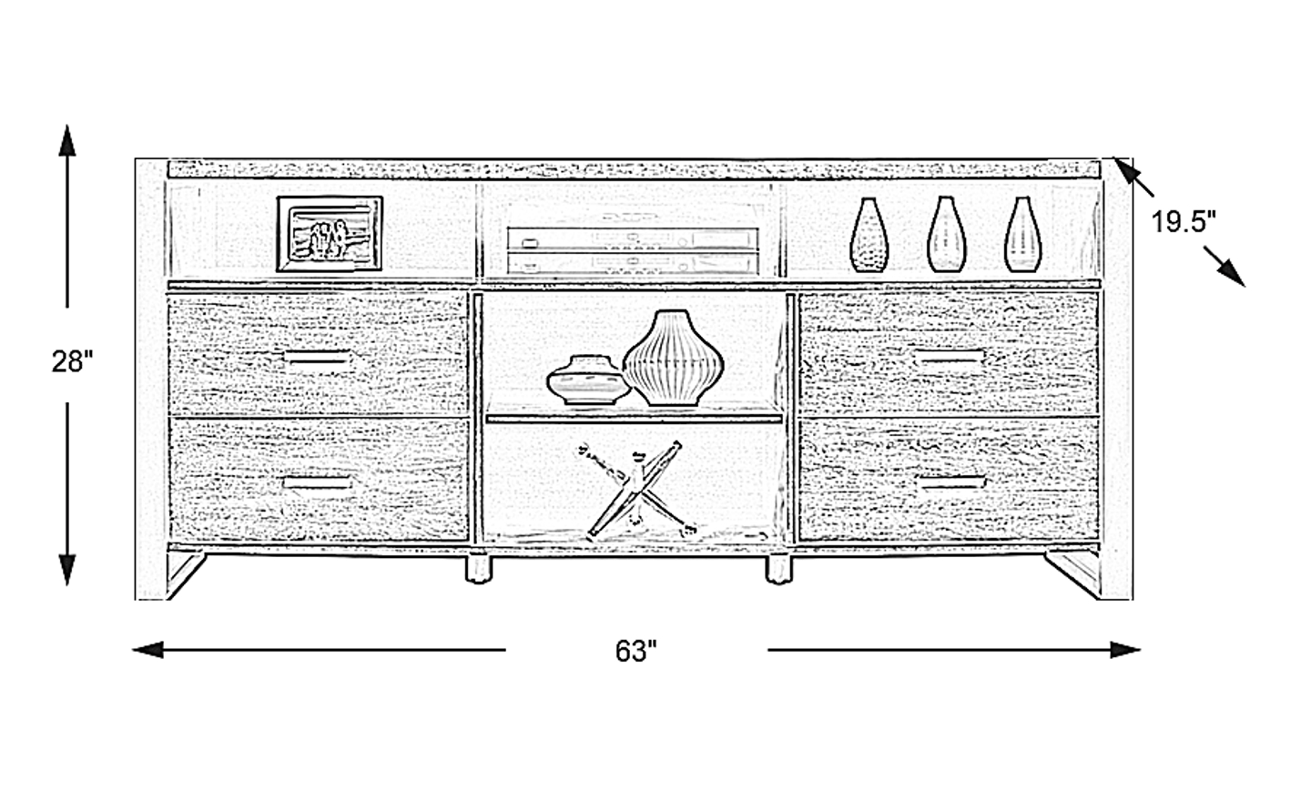 Rustic influence pairs with modern design for the stunning Sunshine Falls console. Featuring a rich, dark brown finish with black detailing on the legs and hardware, this piece makes a statement. Four drawers keep all of your necessities stored and organized while the four shelves all feature wire management holes to keep everything under control.