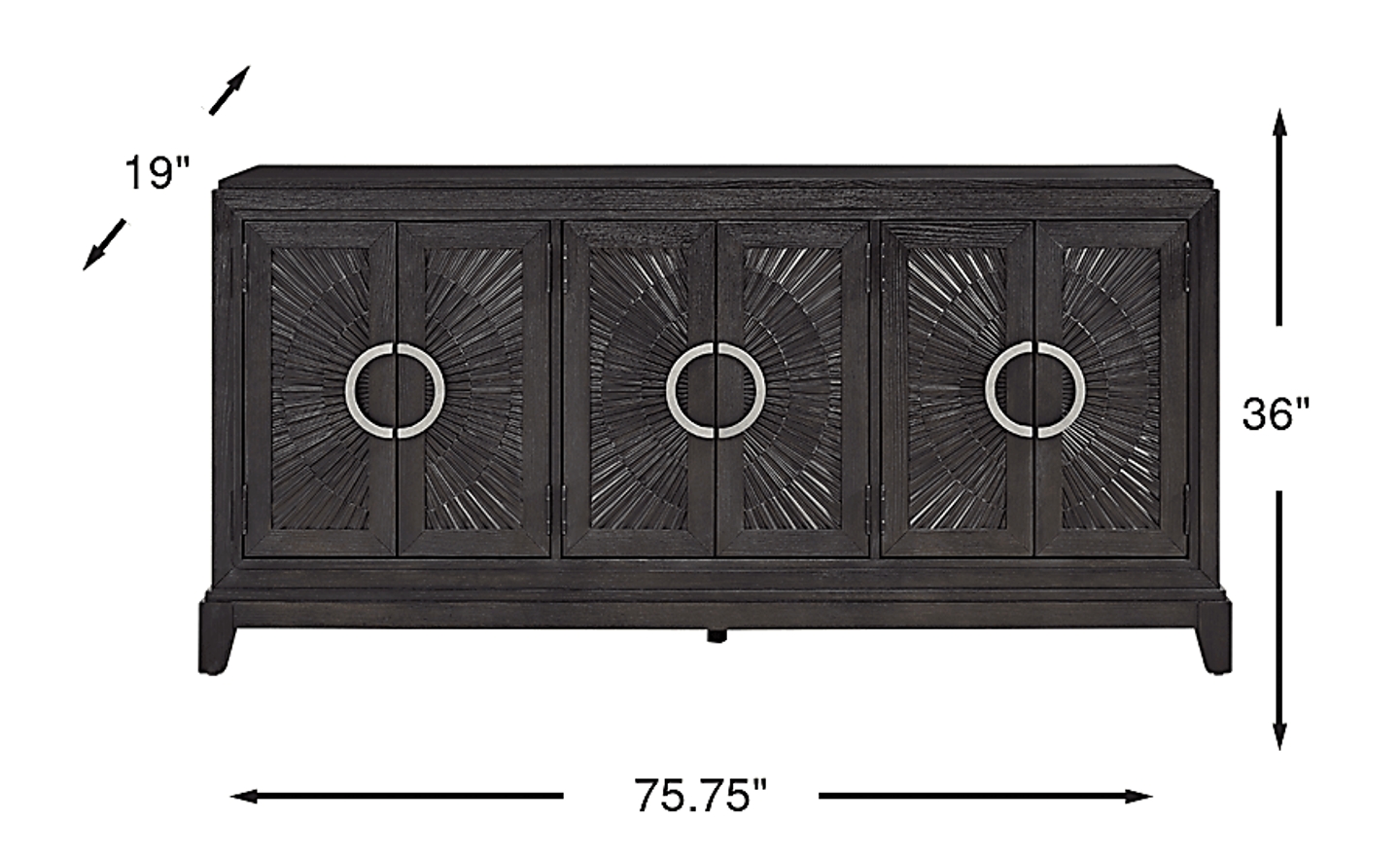 With textures and contours accompanying a stately air and commanding presence, the Sunside Way console is a perfect complementary piece in a room befitting the most eminent of royalty. Constructed using solid poplar in a black finish, this contemporary piece showcases a handsome silhouette with a refined square shaped frame, while its six doors boast silver half circle pull handles and an aristocratic design with carved radial motifs. Behind each pair of doors lie 2 spacious shelves perfect for storing your entertainment essentials.