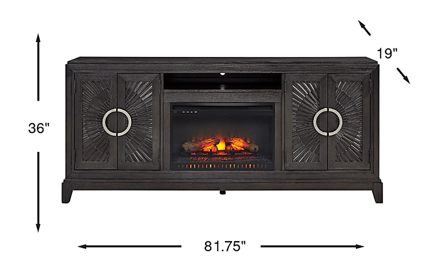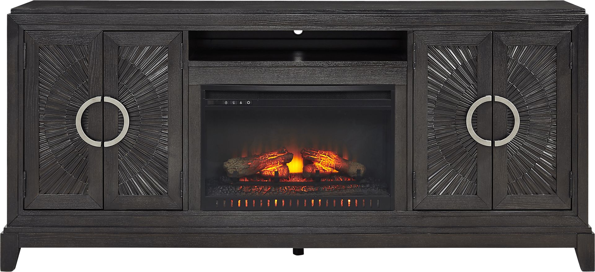 With textures and contours accompanying a stately air and commanding presence, the Sunside Way console is a perfect complementary piece in a room befitting the most eminent of royalty. Constructed using solid poplar in a black finish, this contemporary piece showcases a handsome silhouette with a refined square shaped frame, while its four doors boast silver half circle pull handles and an aristocratic design with carved radial motifs. The center storage cubby and spacious shelves behind each pair of doors are perfect for storing your entertainment essentials. The removable fireplace portion features flickering flames and faux embers, working with or without heat for a warm ambiance year-round.
