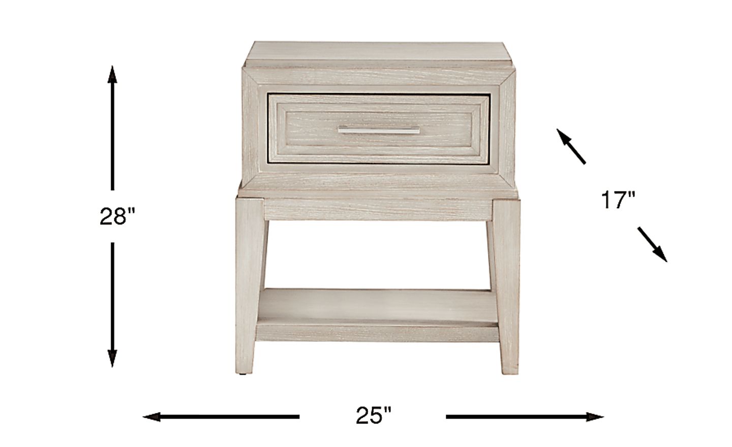 Brimming with luminous contemporary charm, the Sunside Way nightstand offers glorious style for your space. Showcasing a sand-colored finish, this nightstand features a single drawer configured with a French dovetail front and back with ball bearing full extension glides. A metal bar pull finished in gleaming chrome provides the perfect final touch.