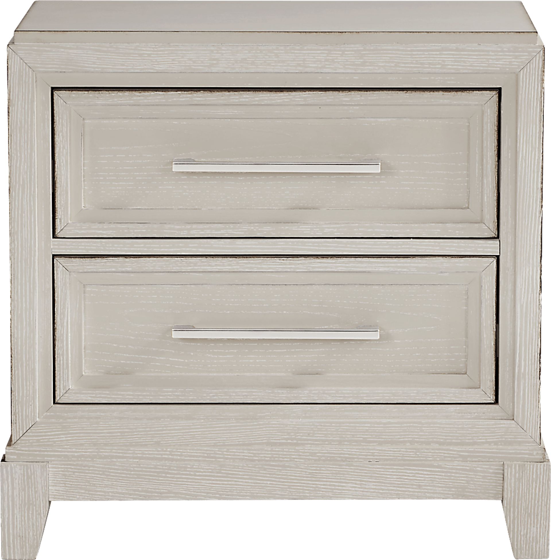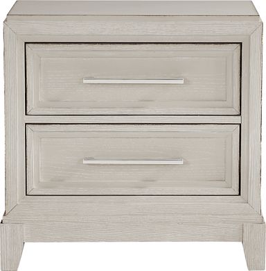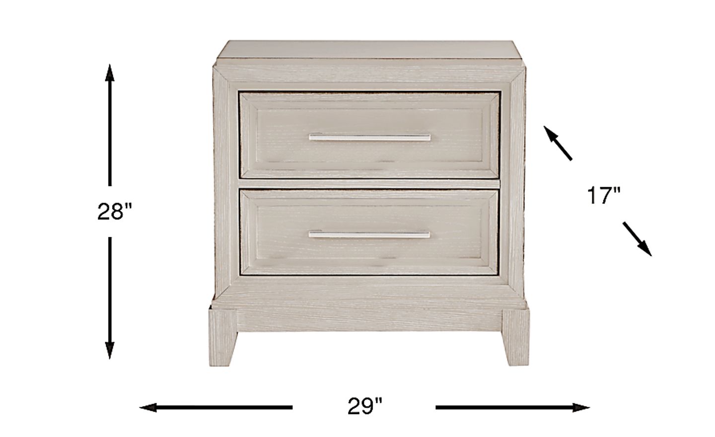 Brimming with luminous contemporary charm, the Sunside Way nightstand offers glorious style for your space. Showcasing a sand-colored finish, this nightstand features two drawers configured with French dovetail fronts and backs with ball bearing full extension glides for seamless beside storage. Metal bar pulls finished in gleaming chrome provide the perfect final touch.