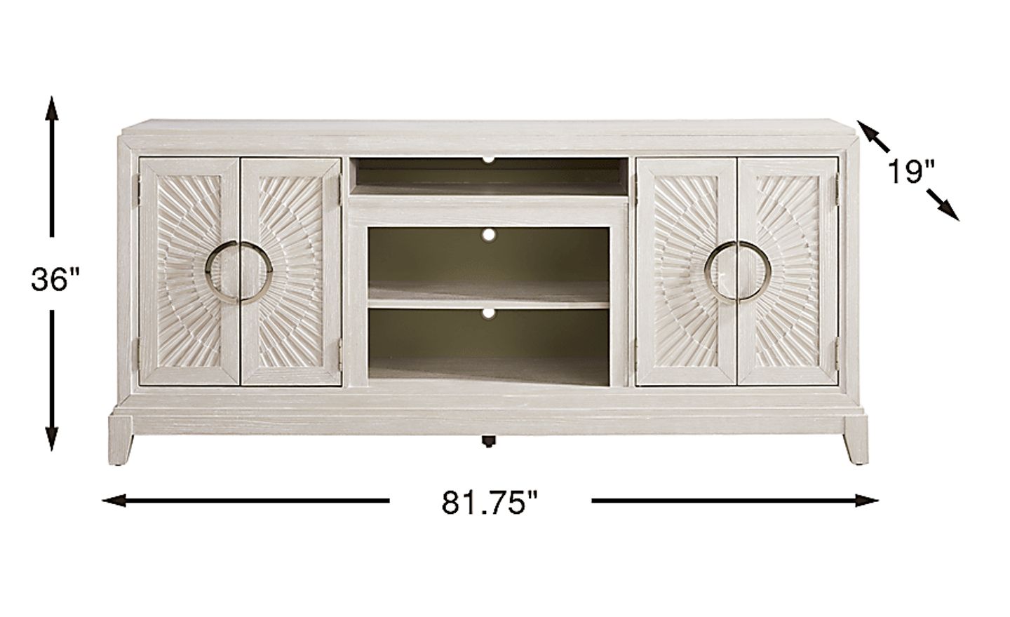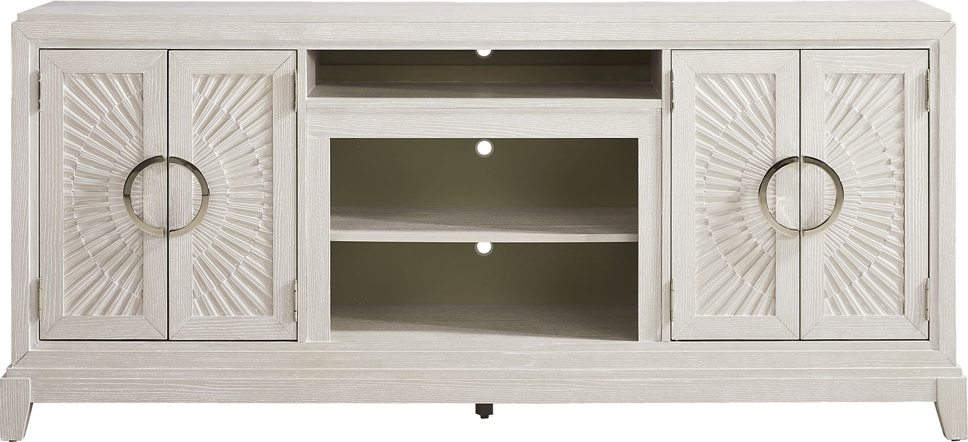 This console features a versatile storage layout including four doors with carved radial motifs that conceal two spacious shelves. It also includes center storage cubbies specifically designed to house gaming consoles, cable boxes, or soundbars. This combination of open and closed storage allows you to display frequently used tech while hiding smaller accessories behind flat-panel doors.